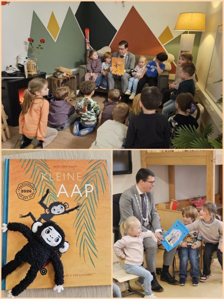 Met veel aandacht en plezier hebben we geluisterd naar het verhaal uit ''Kleine Aap'', prachtig voorgelezen door onze burgemeester.